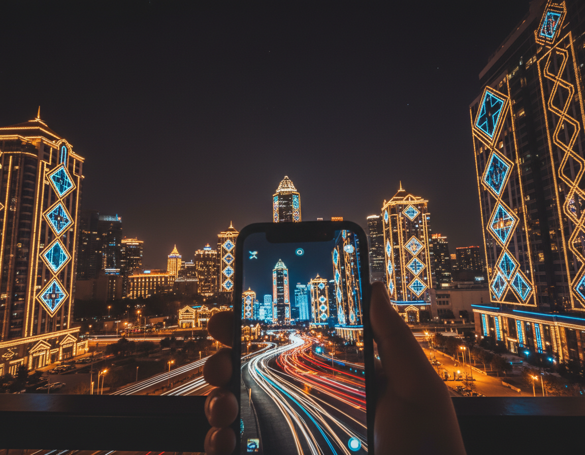 Highlighting architectural lighting details in nighttime city photography with a phone